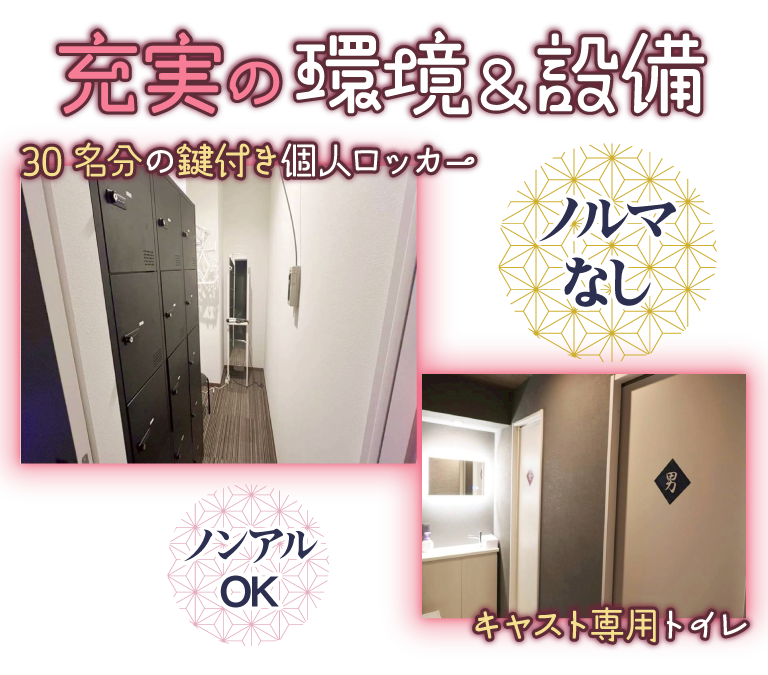 更衣室はもちろん、鍵付きの個人ロッカー・キャスト専用トイレなど・・・